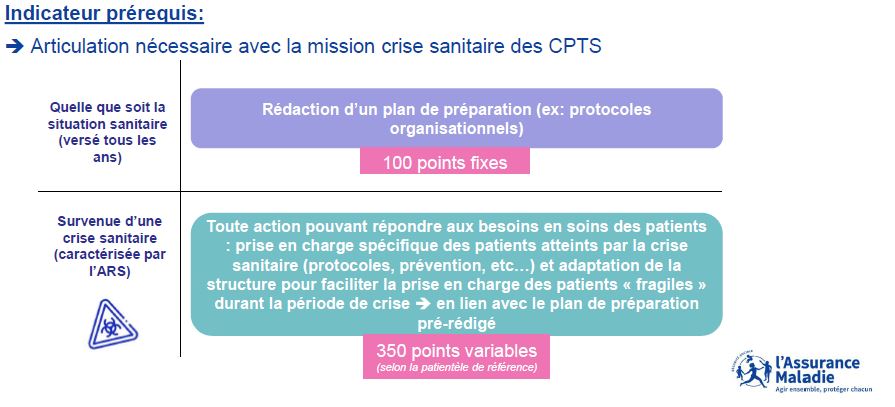 Et pour cause : dans le document de travail que Concours pluripro a pu consulter, la Cnam compte allouer 100 points fixes aux centres de santé pour la rédaction d’un plan de préparation – un forfait versé tous les ans, quel que soit la situation sanitaire – et 350 points variables, selon la patientèle de référence, en cas de crise sanitaire, à "toute action pouvant répondre aux besoins en soins des patients : prise en charge spécifique des patients atteints par la crise sanitaire (protocoles, prévention, etc…) et adaptation de la structure pour faciliter la prise en charge des patients ‘fragiles’ durant la période de crise, en lien avec le plan de préparation prérédigé".