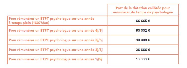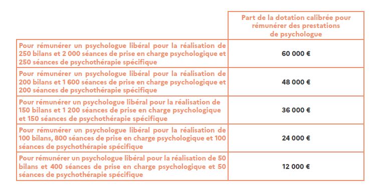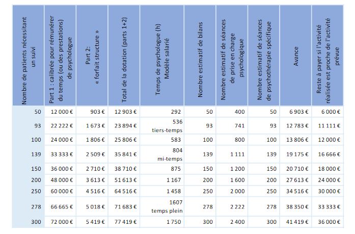 "Cette part de la dotation, versée à la structure, intègre à la fois la rémunération brute du psychologue, mais aussi les cotisations de l’employeur. En fonction du temps de travail convenu entre l’ARS, la structure et le psychologue", la dotation est calibrée comme suit.