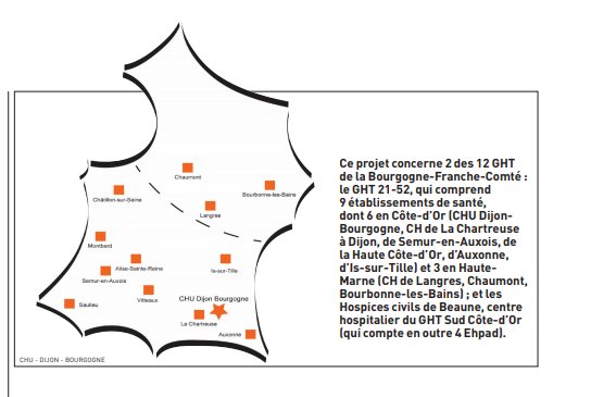 Ce projet pluriprofessionnel implique les professionnels hospitaliers des neuf établissements de santé publics du groupement hospitalier de territoire (GHT) 21-52 (le CHU de Dijon et huit centres hospitaliers), ceux des Hospices civils de Beaune (GHT Sud Côte-d’Or) et de l’hôpital privé Dijon-Bourgogne (groupe Ramsay Générale de santé), ainsi que les médecins, infirmiers et pharmaciens libéraux via les unions régionales des professionnels de santé libéraux (URPS) des régions Bourgogne-Franche-Comté et Grand-Est.
