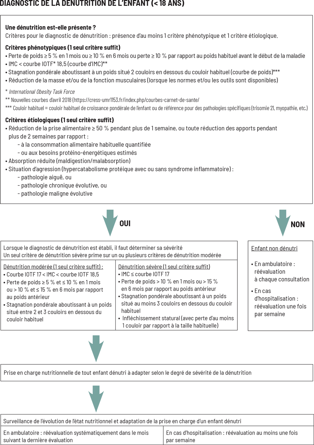 Le diagnostic de la dénutrition chez l’enfant se fait par la présence d’au moins un critère phénotypique et un critère étiologique selon les recommandations récentes de la Haute Autorité de santé (HAS).