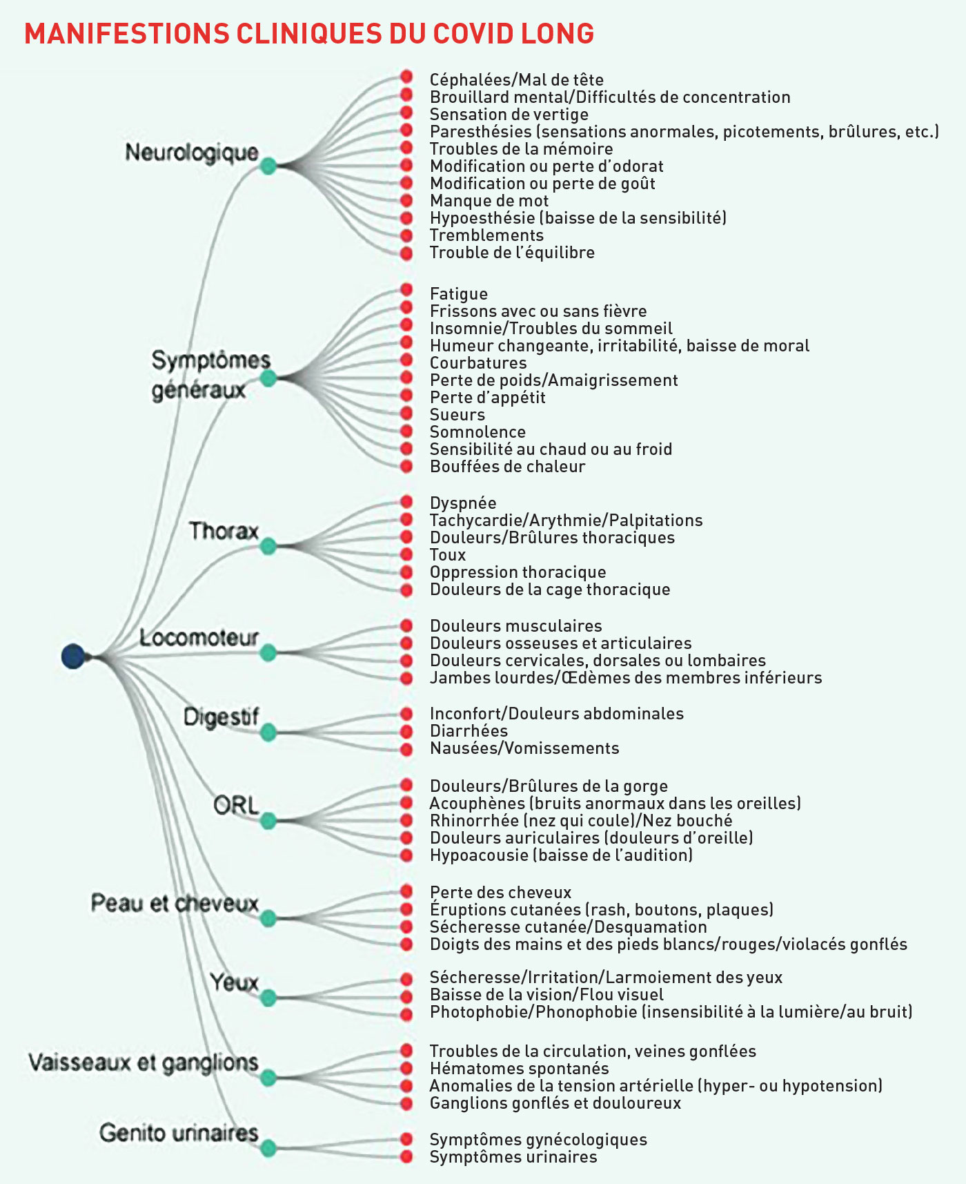 Des symptômes généraux (fatigue, frissons, insomnies, courbatures, perte de poids et d’appétit, bouffées de chaleur) ont été rapportés par les patients, mais aussi d’autres plus spécifiques : des atteintes neurologiques plus ou moins graves (céphalées, paresthésies, troubles de l’équilibre, tremblements), thoraciques, de l’appareil locomoteur, digestives, oculaires circulatoires, de la sphère ORL, dermatologiques ou encore génito-urinaires