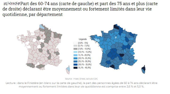 Au plan démographique, si on constate une surreprésentation des personnes âgées dans les zones d’habitat peu denses allant du Sud-Ouest au Nord-Est de la France, elles résident par contre majoritairement dans les grandes agglomérations urbaines et le littoral atlantique et méditerranéen, des zones qui attirent les nouveaux retraités.