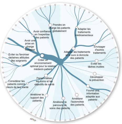 Un grand nombre de propositions abordent la coordination des soins au sein des établissements (identifier un chef d’orchestre qui orienterait le patient après évaluation de ses besoins, développer la télé-expertise) et, dans une moindre mesure, le parcours de soins : faciliter la prise de rendez-vous, regrouper les consultations et examens, aider le patient à trouver le bon professionnel, augmenter le temps et l’attention dédiés aux patients, augmenter le personnel d’accueil…