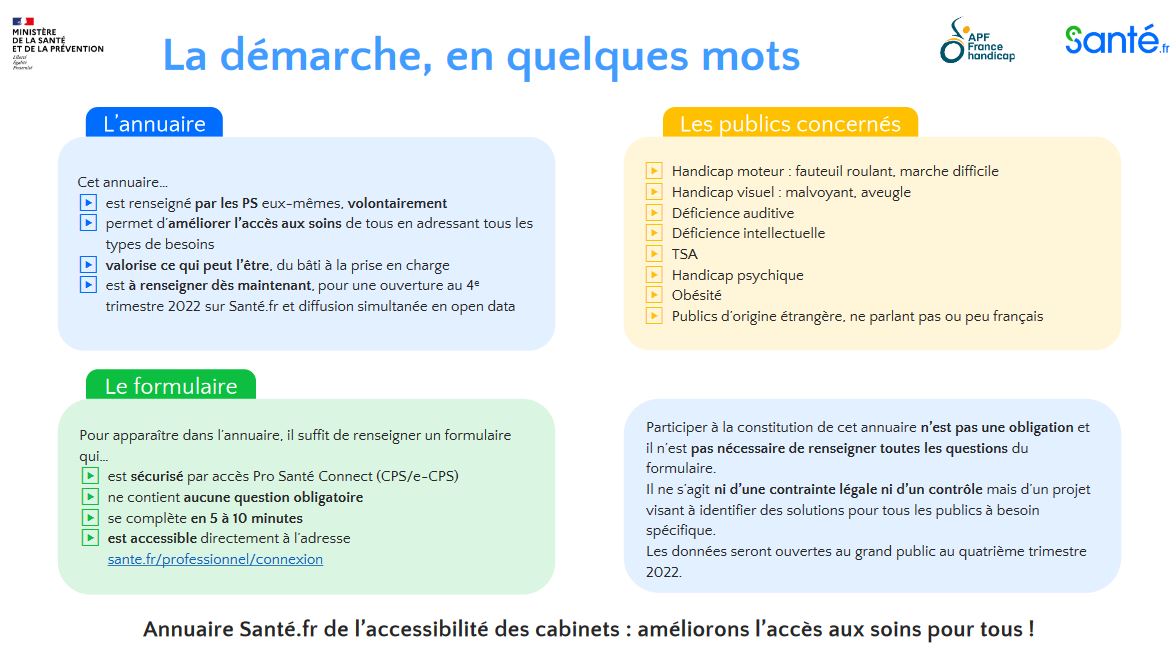 Coconstruit avec des associations, les Ordres professionnels et autres acteurs de l’écosystème santé, cet annuaire "ambitionne de valoriser l’accessibilité des cabinets, par handicap comme par besoin spécifique", précise sante.fr.