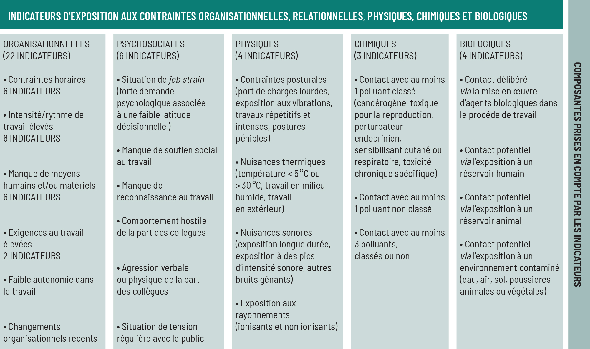 Par ailleurs, l’étude se fonde également sur les 39 indicateurs d’exposition à des contraintes organisationnelles, relationnelles, physiques, chimiques et biologiques subies au cours des activités professionnelles qui ont été repris d’autres études précédentes (Santé publique France ou Dares) ou construits ou adaptés spécifiquement pour cette analyse (tableau ci-dessous).